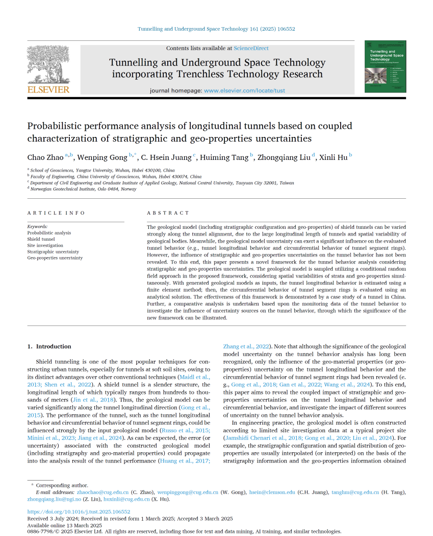 特任教授赵超在《Tunnelling and Underground Space Technology》发表题为“Probabilistic performance analysis of longitudinal tunnels based on coupled characterization of stratigraphic and geo-properties uncertainties”的研究论文(图1)。赵超为第一作者,长江大学为第一完成单位。