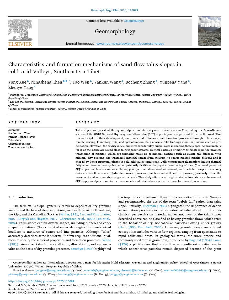 地质系、工程地质研究中心团队成员薛阳副教授在地球科学领域老牌期刊《Geomorphology》(中科院大类二区)上发表题为“Characteristics and Formation Mechanisms of Sand-Flow Talus Slopes in Cold–Arid Valleys, Southeastern Tibet”的论文(图1),薛阳副教授为第一作者,陈宁生教授为通讯作者,长江大学为第一完成单位。