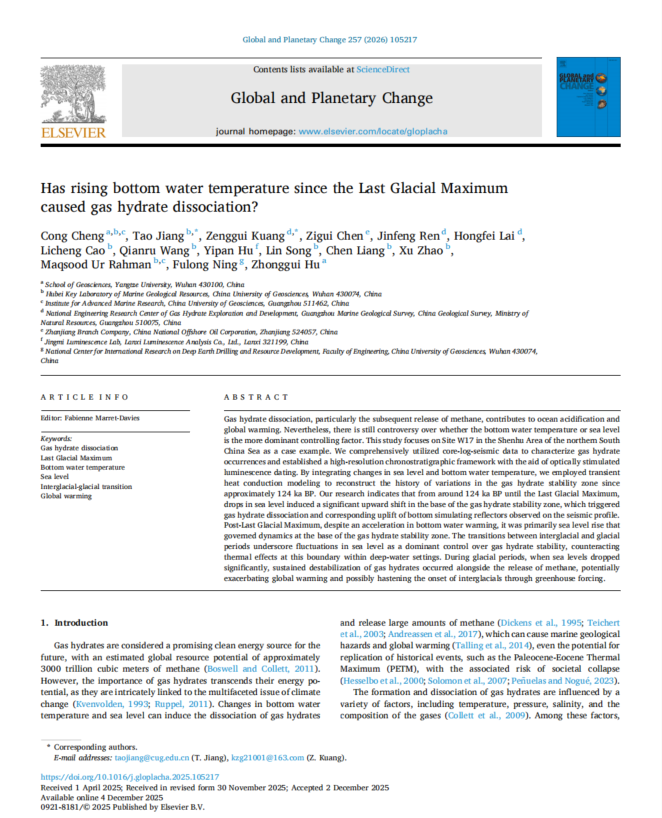 地质系、深层碳酸盐岩与非常规油气储层研究中心团队成员程聪特任副教授在中科院一区TOP期刊《Global and Planetary Change》发表题为“Has rising bottom water temperature since the Last Glacial Maximum caused gas hydrate dissociation?”的研究论文(图1)。程聪为第一作者,金碧娱乐场