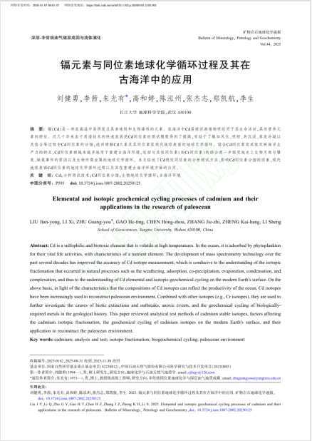 2025级地质学专业博士生刘健勇以第一作者身份在中文核心期刊《矿物岩石地球化学通报》上发表题为《镉元素与同位素地球化学循环过程及其在古海洋中的应用》论文。金碧娱乐场