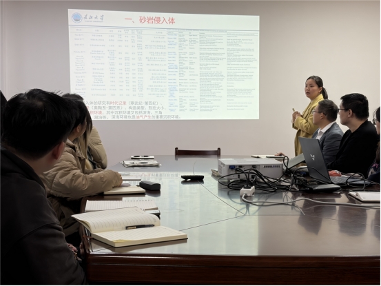 易雪斐副教授以“砂岩侵入体研究进展”为主题进行了交流分享。易雪斐老师详细地介绍了砂岩侵入体、软沉积物变形的研究进展,以及项目组在砂岩侵入体沉积模拟研究所取得的认识,为现场师生带来了一场精彩的学术交流。