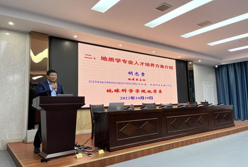 胡忠贵主任从金碧 和地质学的办学历史、师资力量、实践平台、人才培养等方面做了详细介绍。从通识课程、主要专业课程、专业实习实践等方面需要达到的要求给同学们详细介绍了地质学专业的人才培养方案。