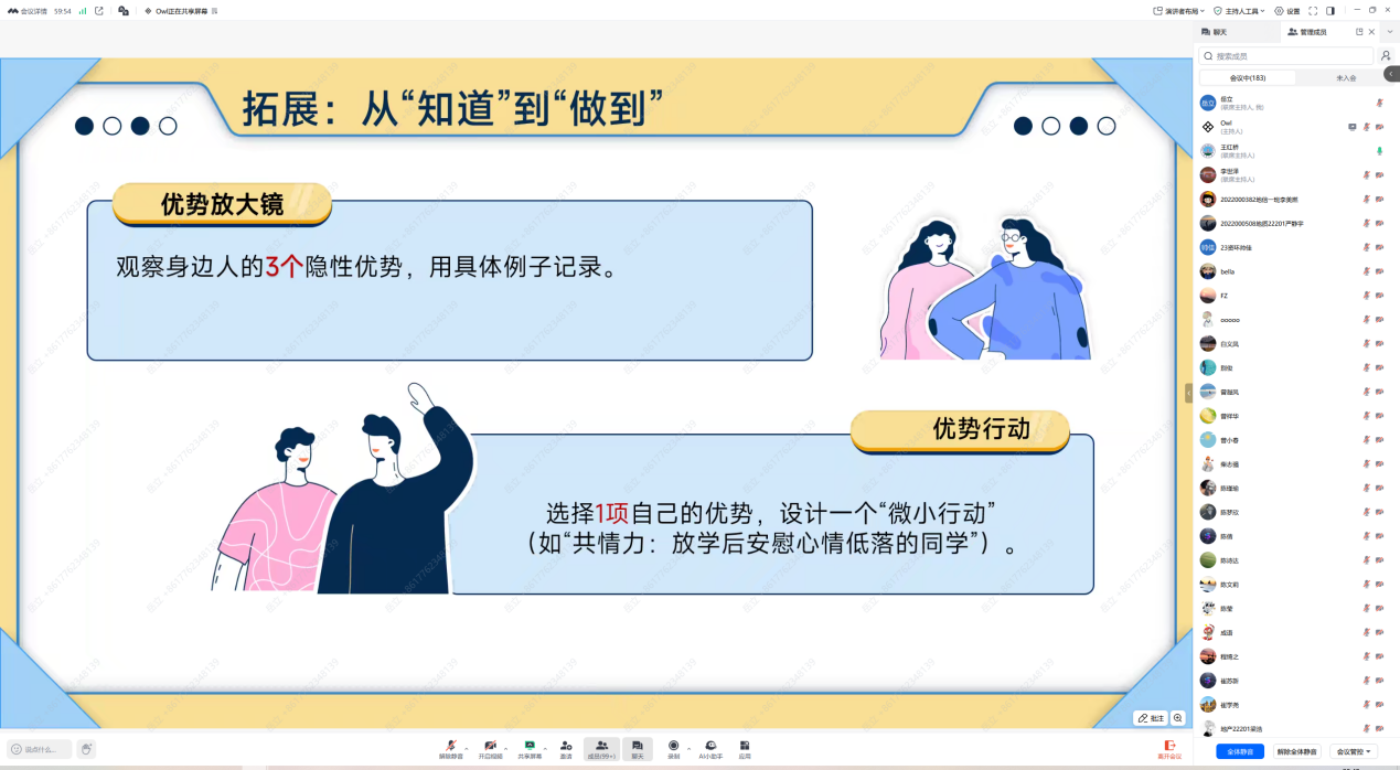 (通讯员 郝兴瀚)为筑牢校园心理防线,5月22日、23日晚,金碧娱乐场 心理专干王红桥老师在13教B122主讲“认识自己,悦纳自己”心理健康培训,2024级141名学生骨干现场参与,线上本、研究生各年级累计452人通过腾讯会议同步学习。 王红桥老师从生理自我、心理自我、社会自我三个维度展开对自我认知的讲解,并分享增强自我认同的两个自我探索的方法:“20个我是谁”、“每日优点记录”,她还介绍了“优势卡牌”,引导同学们通过与他人的互动发现潜在优势。结合大学生心理困惑案例,王老师带领同学们剖析自我认知偏差的成因与表现,深化了大家对自我认知的理解。对于如何悦纳自己的缺点与不足,王老师用具体生活事例说明不同特质在学习、生活和职业发展中的作用,并分享“优势探索表”,指导大家转换对缺点的看法和评价,提升心理健康水平。 此外,王老师强调了学生骨干在校园心理健康工作中的重要作用,邀请大家履行职责,以身作则做示范、宣传知识、关注同学动态并及时反馈、推荐有需要的同学寻求专业帮助。培训最后还介绍了心理中心的服务项目与学校四级心理危机干预体系的运作机制,呼吁大家积极参与心理健康教育,共筑校园心理防护网。 (审核 冯舒 编辑 王红桥)