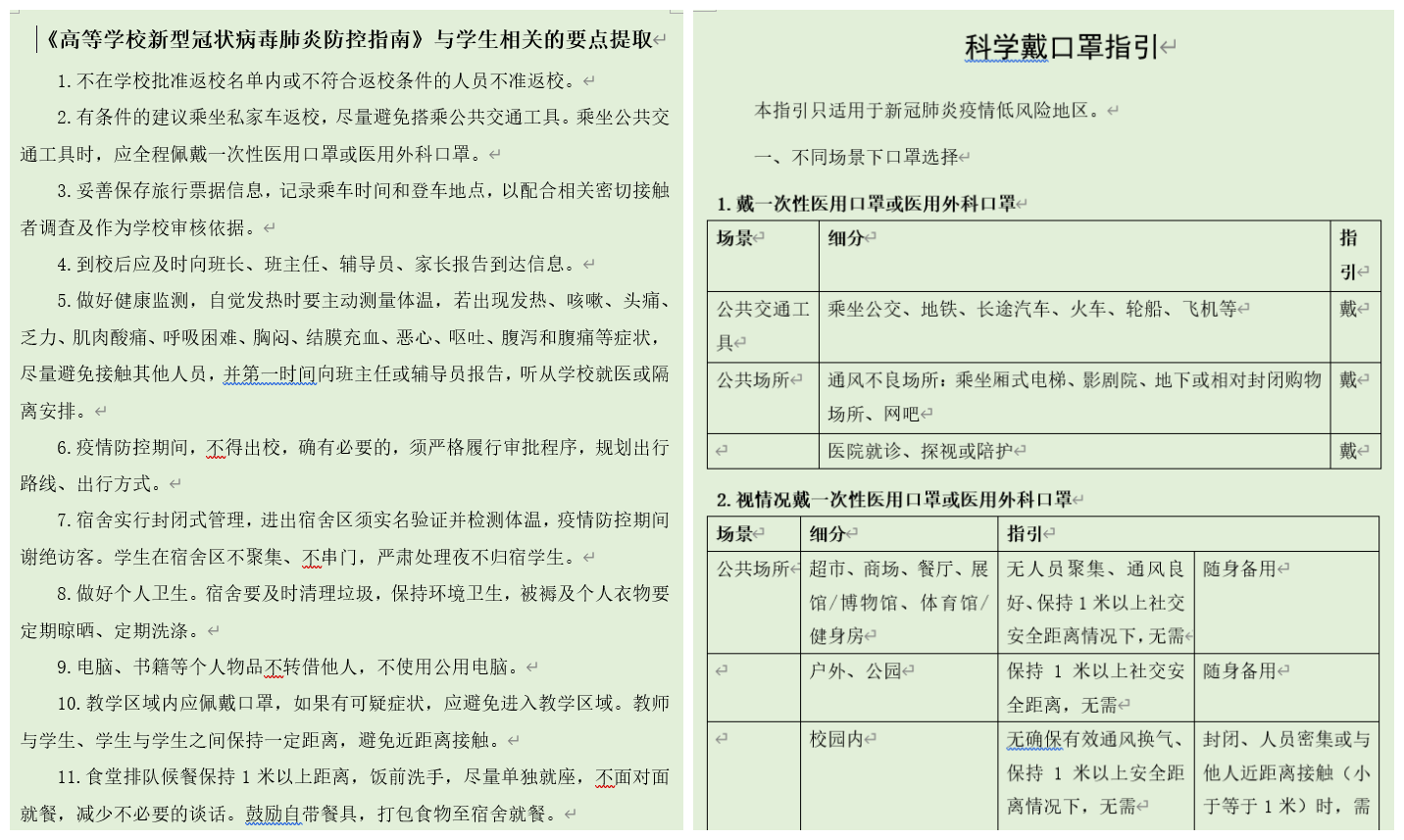 (通讯员:郭霖)根据当前常态化疫情防控形势和复工复产复学需要,金碧娱乐场 全体学生于5月27至31日学习了《公众科学戴口罩指引(修订版)》、《夏季空调运行管理与使用指引(修订版)》和《高等学校新型冠状病毒肺炎防控指南》三个疫情防控文件。为保证学习效果,学工办老师在认真研读文件的基础上,根据将来学生复学返校可能面临的防控重难点,结合金碧 学生具体情况,对文件内容进行了梳理与提炼,整理出相关学习要点,由年级辅导员具体负责组织学生学习。