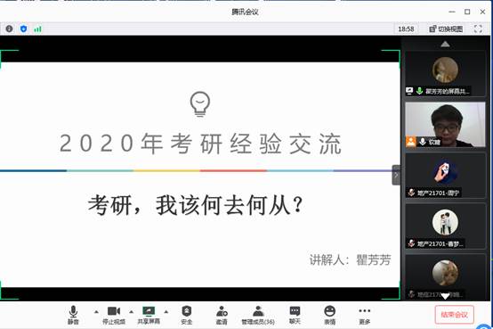 6月11日晚7点半,地信21602班瞿芳芳同学和地信21601班吕文超同学给2017级地信专业开展线上考研经验交流,他们分别以优异的成绩被武汉大学和中国矿业大学录取为硕士研究生。作为一名成功考上武汉大学的学霸,瞿芳芳同学首先告诫考研的同学们要“忠于现实,明确目标”,在考研的路上一定要“耐得住寂寞,顶得住诱惑”,随后她就考研常识、考研规划和备考初试复试进行了详细解读,她强调了夏令营活动的重要性,这是一个可以帮助我们在同等条件下优先被录取的渠道。今年考取中国矿业大学的吕文超同学首先就地信专业考研难度进行了分析,他强调了“考研务必明确方向,切勿盲目跟风”,同时他也分享了优质考研资料的获取渠道并强调了关注时事热点的重要性,最后他就如何调整复习心态进行了切身介绍,同学们纷纷表示获益匪浅。