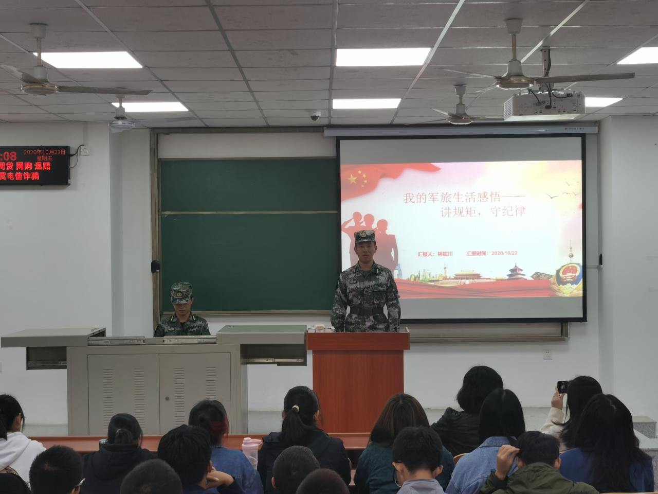 (通讯员 陶潇桐)为了优化学生管理,帮助新生自觉养成讲规矩、守纪律、珍惜时间的好习惯,金碧娱乐场 邀请从海军陆战队退伍的地信21701班林竑川同学于10月23日在武教B-106举行了以“讲规矩,守纪律”为主题的军旅生活分享会。党委副书记任倩老师、辅导员郭霖老师,地信22001和地信22002班全体同学参加了本次活动。