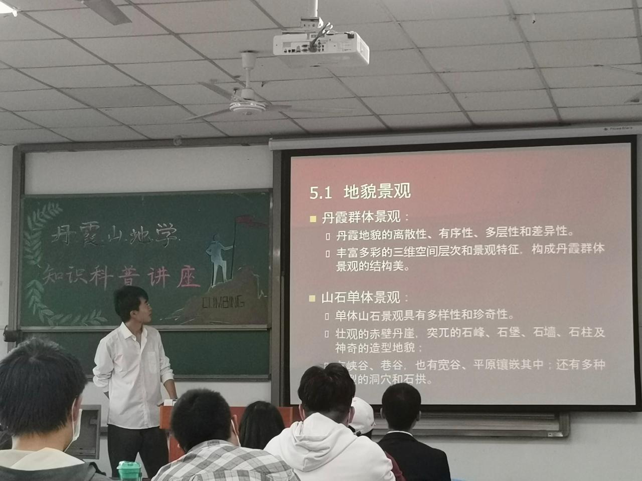 讲座开始,首先由主持人陈昱涵为我们简单介绍了主讲人徐明帅以及他所参加志愿活动的组织“脚爬客”。紧接着,徐明帅以两段简短的丹霞山视频开始了今天的演讲,这两段视频记录了他们在丹霞山科普学习生活的点点滴滴和丹霞山的美景,他根据自己的所见所学所感生动形象地讲述了丹霞山的地貌的特征以及形成过程。