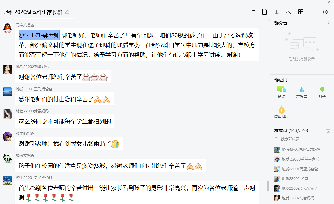 (通讯员:郭霖)11月20日晚7点半,2020级本科生家长群热闹非凡,学工办全体老师与家长们齐聚一堂,召开了20级本科生第一次线上家长会。本次家长会由金碧 党委副书记任倩老师主持,20级辅导员郭霖老师以“文字+图片”的形式,主要从安全教育、学习情况总结、课外活动三个方面向家长们展示了同学们在校期间的学习与生活。