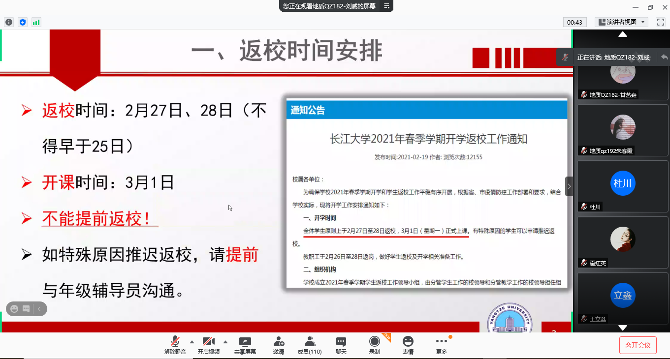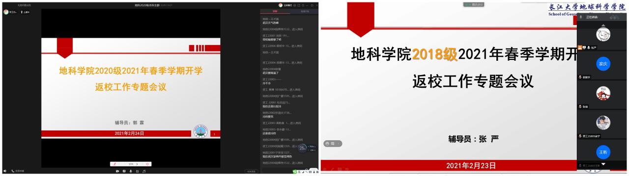 主题班会从返校时间安排、返校流程和2021年春季学期重点工作三个方面展开。首先,辅导员老师为同学们讲解了返校及开学的时间安排,并向大家强调不能擅自提前返校,对因特殊原因延迟返校的同学需要办理的手续进行了规定与解答。接下来,辅导员老师对返校的6步骤逐一进行了讲解,特别是对“申报”环节的“填写行程信息、提供通信大数据行程卡和健康绿码截图”与“核准”环节是否需要核酸检测结果等重难点进行了耐心的解释说明。随后,20级将英语四级考试、17和18级将就业及考研工作分别作为春季学期重点工作向同学们进行了强调与动员。最后,辅导员老师对大家的疑问一一进行了解答,并提醒同学们旅途做好防护。