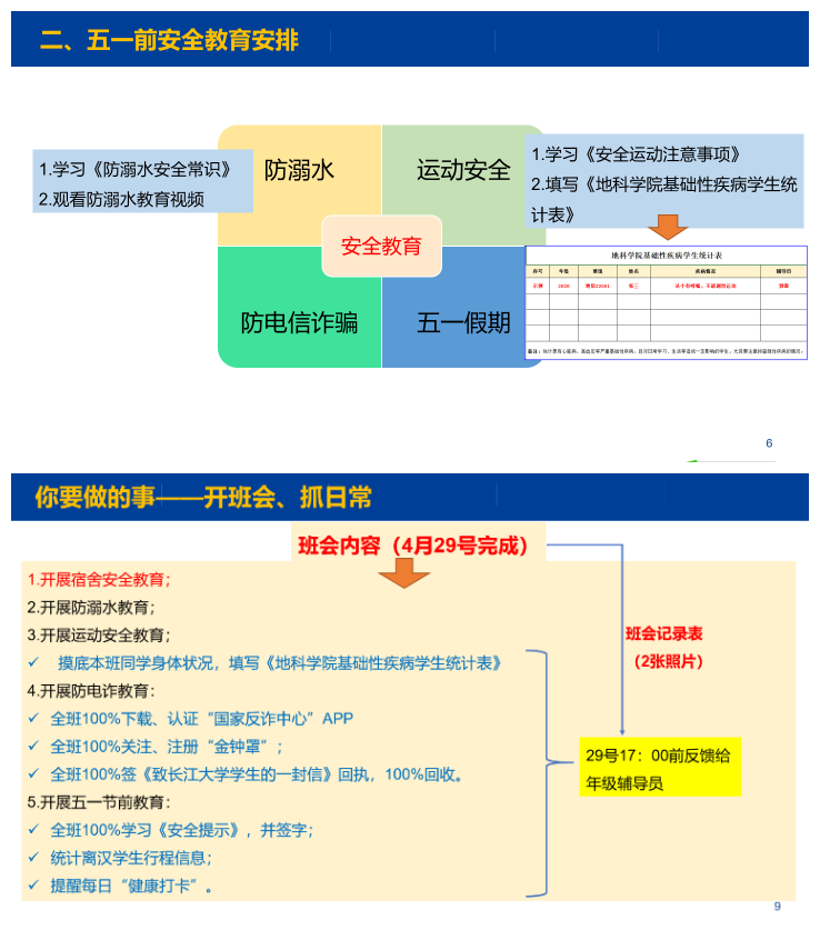 接下来,郭霖老师针对一系列安全问题做了详细安排和说明。一是宿舍管理方面。郭老师通报了4月份金碧娱乐场 学生宿舍使用违规电器和晚归情况,并对事件危害进行了分析,提醒大家务必遵守学校相关规定,安全高于一切。二是五一假期安全。要求各班班长召开安全主题班会,在班会上做好防溺水、运动安全、防电信诈骗和五一假期安全四个方面的教育,重点做好“国家反诈中心”APP和微信公众号“金钟罩”的下载与认证、假期离汉学生的行程登记、假期安全教育告知书的签收等。