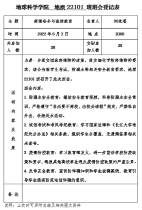 (通讯员 周再文)为有效预防疫情传播,确保学生身体健康和生命安全,6月1日至6月,金碧娱乐场 以班级为单位,充分发挥年级辅导员、班主任在安全教育中的引领作用,通过主题班会等形式,广泛开展学生疫情防控教育与安全教育班会,从严从紧、落实落细学校对于疫情防控、毕业生安全离校、防溺水、学生四六级以及诚信教育等相关工作要求,全力守护校园安全稳定。