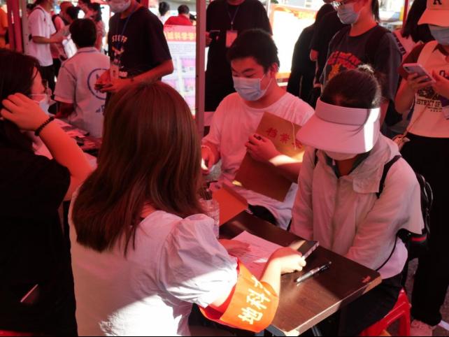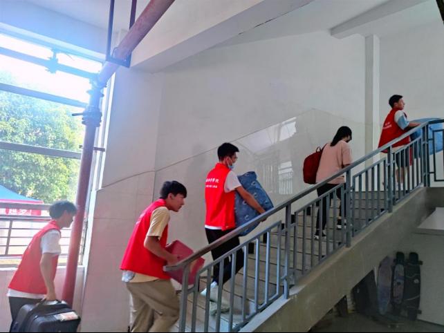 通过前期安排,新生到达金碧 迎新点后,按报到流程,进行行李消杀、身份核查、领取通行证及校园卡、登记信息、然后在志愿者的协助下搬运行李,到宿舍办理入住。