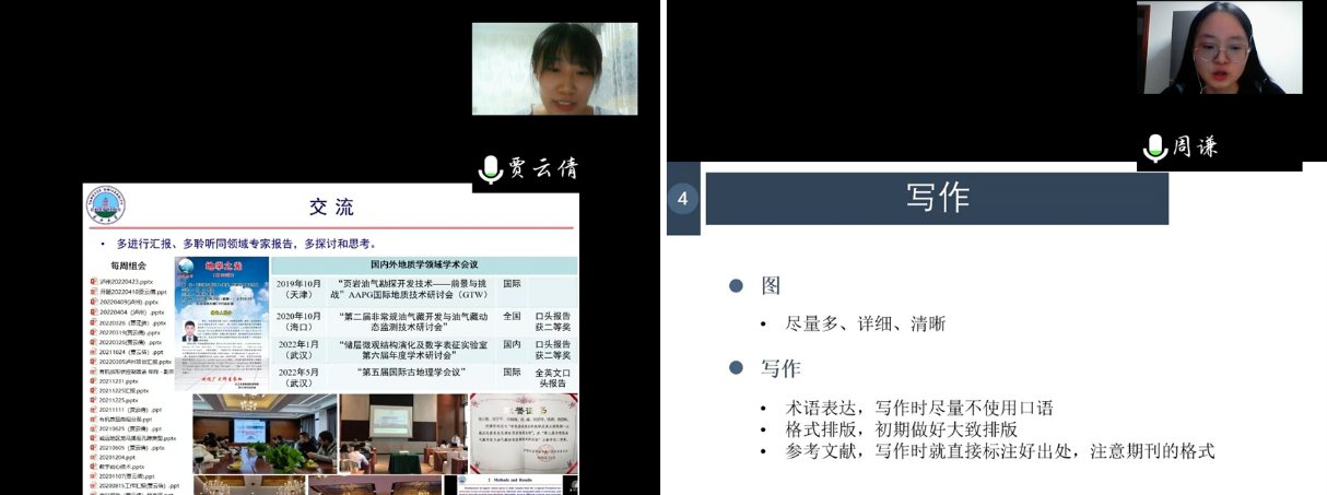 接下来由贾云倩和周谦通过线上的方式分享她们的学习与科研经验。贾云倩同学自研究生以来,先后在全国和全球学术会议作了四次学术汇报,撰写了四篇国内外期刊学术论文。会上她介绍了自己如何积累,如何提升自己的科研水平和能力等经验。最后一位是周谦同学,她按照“基本概念理解-查找-整理-阅读文献-写作”的顺序向大家介绍了自己撰写论文的思路和方法,他还强调,在写作过程中规范的术语表达能为文章增添色彩,因此写作时尽量不要使用口语。