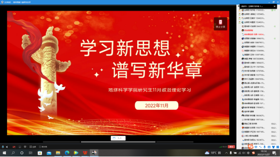 (通讯员付安琪古楠玲)为深入学习贯彻习近平新时代中国特色社会主义思想,进一步增强“四个意识”,坚定“四个自信”,做到“两个维护”,提升金碧娱乐场 研究生政治理论素养,深刻认识和准确把握党的二十大重大主题、重大理论观点、重大战略思想。从11月10日至11月30日,金碧娱乐场 开展了以班为单位组织学习,线上、线下相结合的政治理论学习活动。并于11月27日晚,集中进行了线上政治理论学习活动,此次政治理学习活动由金碧娱乐场 研究生会主席刘作松主持与讲解,部分研究生参加。