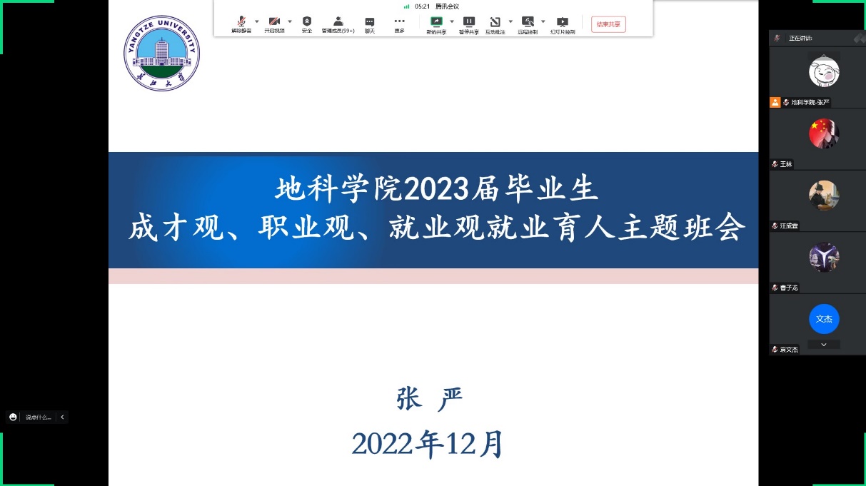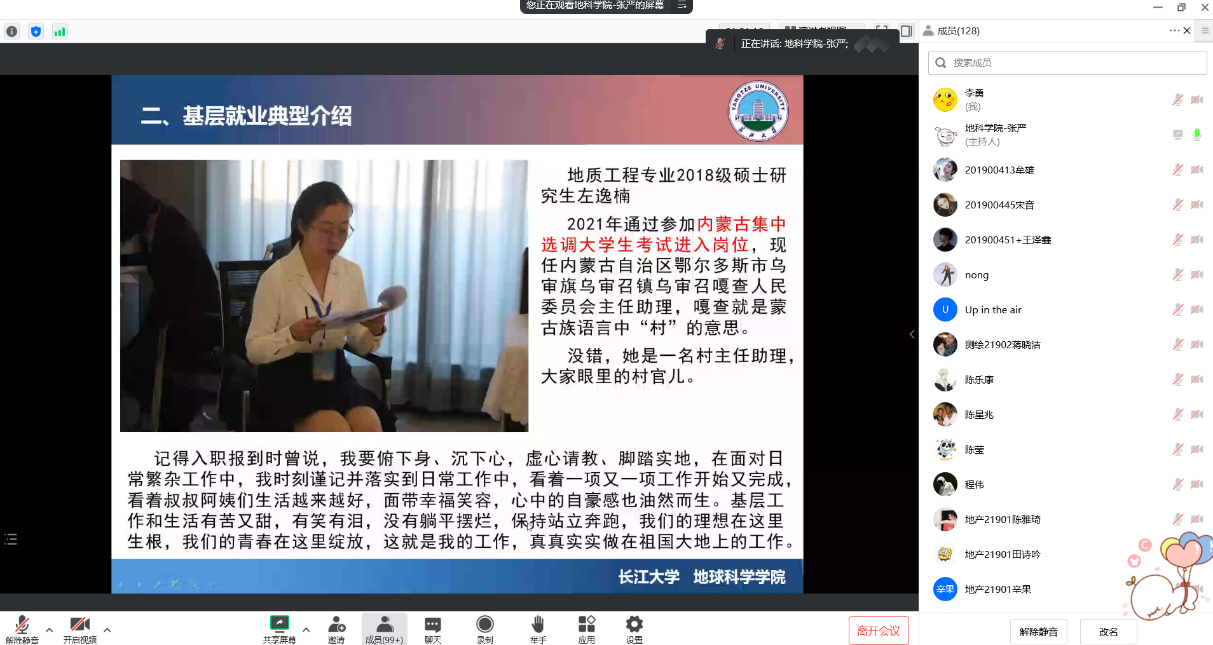 在就业育人主题班会上,金碧 以21届优秀毕业生左逸楠、唐帅为例介绍了基层就业典型案例,讲述了毕业生通过考取公务员和参军入伍等职业途径在基层发光发热的优秀事迹,引导学生做新时代新青年,把个人理想追求融入到党和国家事业之中,树立崇高的职业理想,鼓励更多毕业生到基层去、到西部去、到祖国需要的地方去建功立业、实现人生价值。