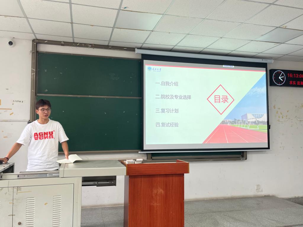 地质(工程)21901班夏彩雨同学以总分第三名的优异成绩荣录中山大学研究生,她在分享时建议大家无论是院校选择还是复习进度,不要与他人攀比,保持自己的节奏最重要。“在自我介绍中要着重强调自己的优势,比如参加了野外实习、本科期间参加过科研项目”是她给大家的复试小Tips。地质(资源)21091班刘辉同学着重分享了考研数学的复习经验,他说“学习数学没有捷径,要多刷题,多练习,认真仔细,学会总结。”