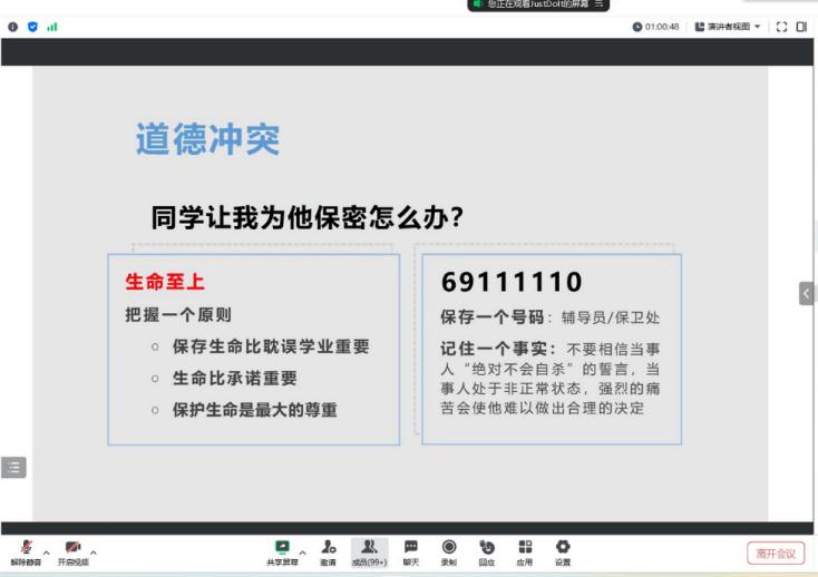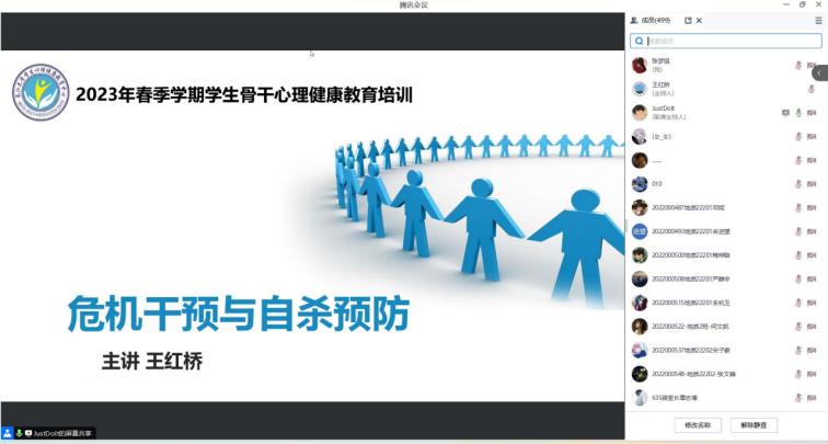 (通讯员 张梦琪)金碧娱乐场 于2023年6月30日通过腾讯会议的方式举行以“危机干预与自杀预防”为主题的心理讲座。各年级班长、团支书、安全员、心理委员、寝室长及暑期留校学生等共计499名师生参与学习交流,心理专干王红桥老师主讲。