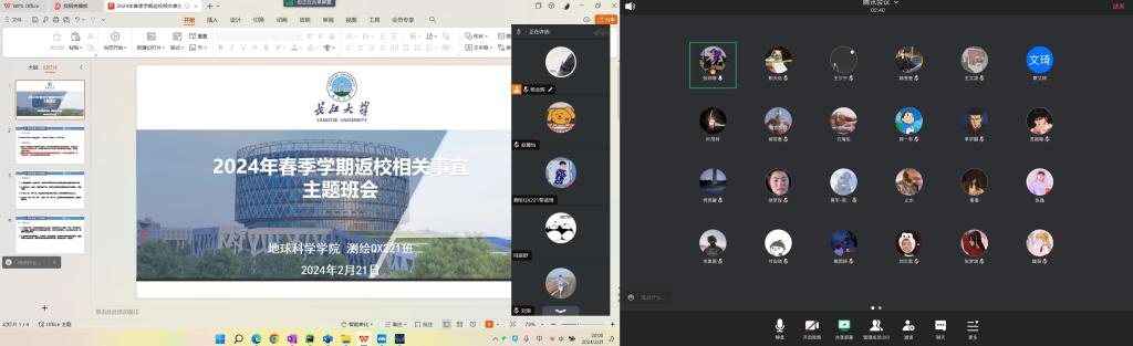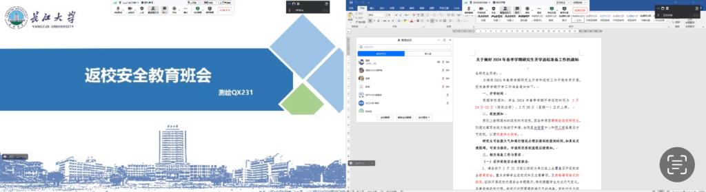 (通讯员 王少宁)武汉新一轮雨雪极端天气来袭,为确保学生平稳有序返校,金碧娱乐场 学生事务办公室接到校党委学生工作部工作要求后,于2月20至22日组织全体研究生参加以班级为单位,通过腾讯会议等平台召开的2024年春季学期返校安全教育班会,会议由各班班长主持。