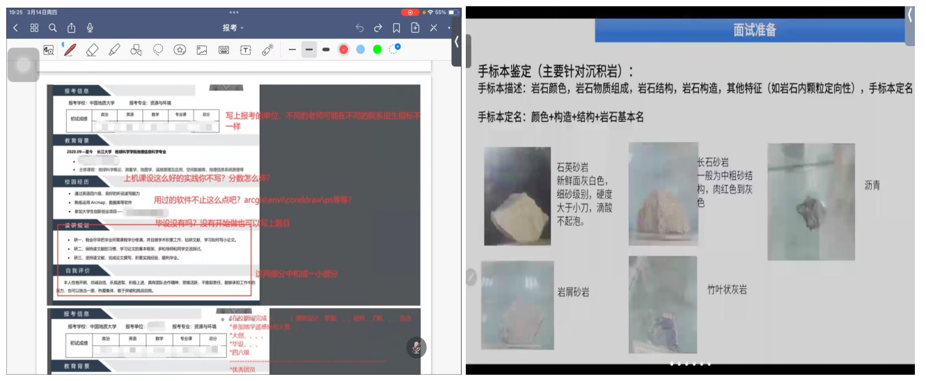 陈雅琦同学介绍了中国地质大学(武汉)GIS中心的复试流程,包括面试、笔试、上机环节,提醒大家要制定合理的复习计划,保证基础知识的全面掌握,熟悉软件操作步骤、多做模拟题。还以一位同学的简历作为例子进行了“手把手”的修改指导,帮助大家明白简历该如何突出亮点,展现优势。刘汀同学针对手标本鉴定、地震剖面图识别、卫星图像识别地质现象等实验考核环节,提醒大家考前多观察多练习。两位同学还就是否需要提前联系导师等问题给出了自己的经验和建议。
