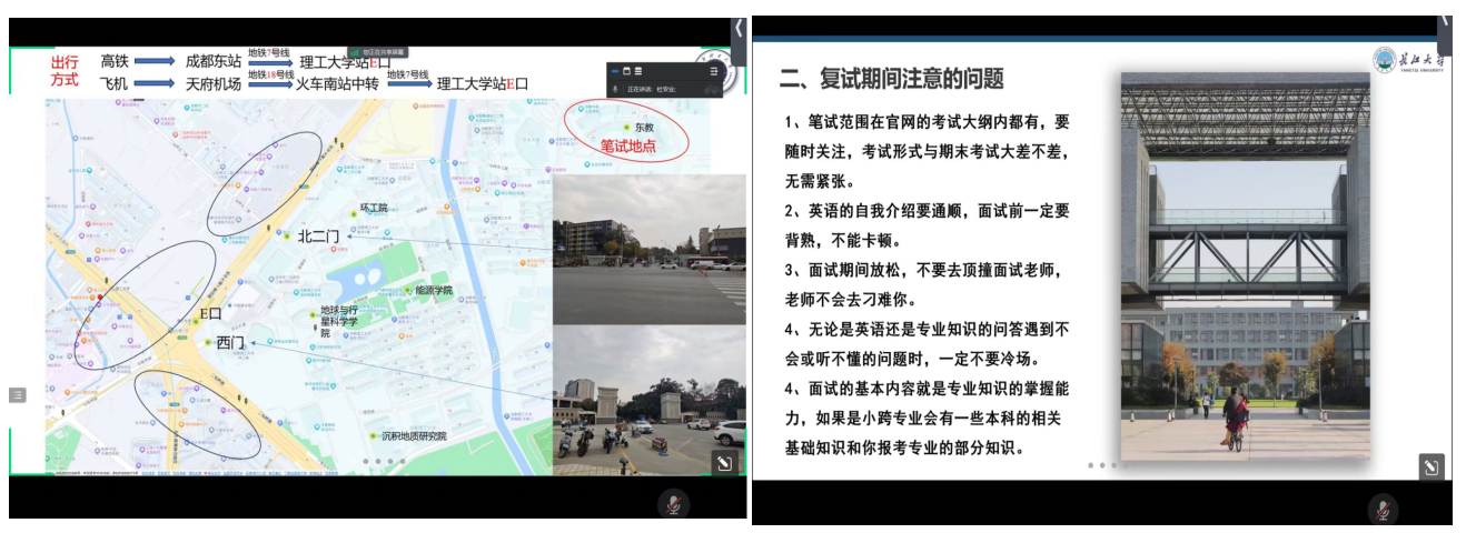 来自成都理工大学的杜安业为同学们介绍了学校周边环境,在出行方式和酒店预订等方面给予大家温馨提示,还特意收集了去年考取其他金碧 的校友联系方式,方便同学们进行更有针对性的联系。去年成功调剂到昆明理工大学的王毅博为大家分享了自己的调剂经验,以及如何拓展调剂信息的搜集渠道、复试时需要注意的问题和面试技巧等。杨肖利同学将中国石油大学(华东)研究生复试的环节、科目内容等为大家进行深入浅出的讲解,重点强调了保持良好心态的重要性,鼓励大家自信应考,避免焦虑紧张。