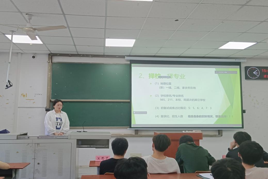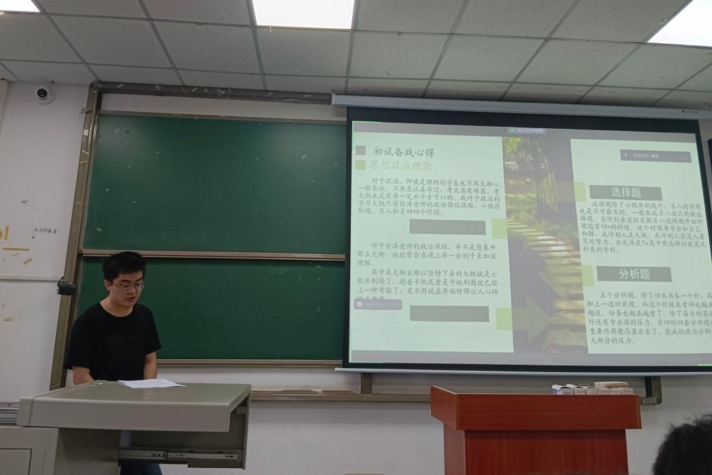 会议伊始,来自地质(资源)22002班的汪思艺分享了他备考本校的心路历程。他从长江大学的科研实力、师资力量、奖助津贴等方面详细介绍了报考本校的优势,鼓励大家积极选择在本校深造。