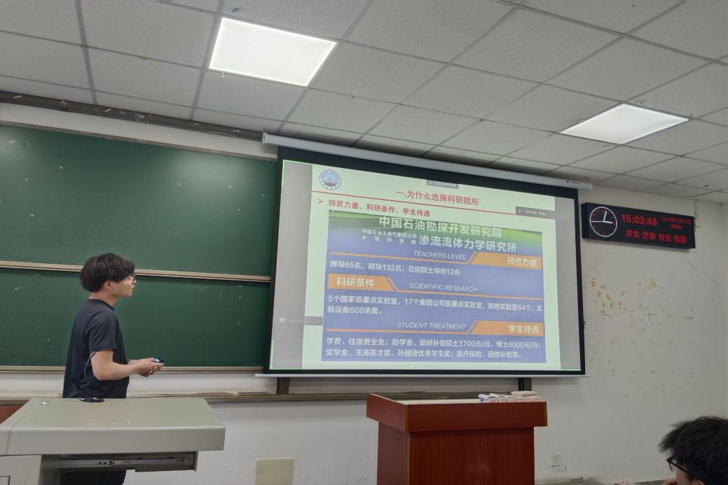 资工(油光)22001班柴世龙重点讲解了自己考上中国石油勘探开发研究院的方法与经验,通过横向对比国内相关科研院所与高等学校,带领大家深入了解科研院所的师资、科研、入学待遇及招录情况。与此同时,提醒同学们应多多关注招生单位的学术夏令营活动,为同学们选择目标院校提供新的思路。