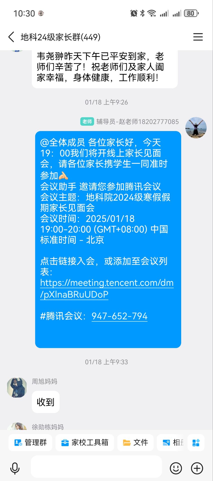 (通讯员 郭禹)为进一步加强家校沟通,凝聚育人合力,金碧娱乐场 于1月18日晚7点,24级本科生辅导员赵娥老师通过腾讯会议的形式,组织召开了2024年秋季学期未线上家长会。会议围绕上学期工作总结、假期安全提示与新学期展望三个方面展开,重点强调了“家校协同育人”的重要性。