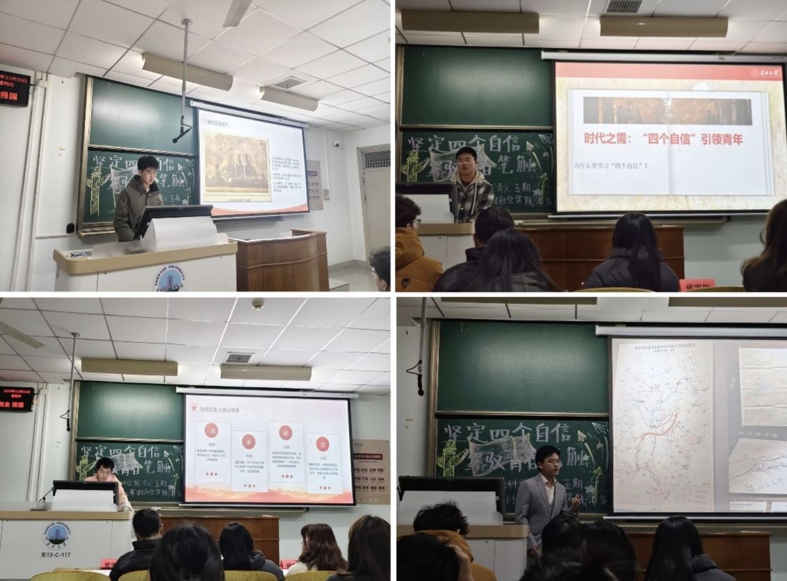 小组成员们结合自身在寒假期间走访红色教育基地、探寻“四个自信”的经历,进行了精彩而深刻的汇报。吴睿同学在家乡红安县参观烈士陵园后深受触动,“先辈们的奋斗历程让我深刻认识到,中国特色社会主义道路是历史和人民的正确选择。作为新时代的青年,我们应传承红色基因,为实现中华民族伟大复兴而不懈奋斗!”张东旭同学也分享了他的学习心得,“通过深入学习马克思主义理论,我对这一科学理论有了更深层次的理解。它不仅为我们提供了认识世界的方法,更指引我们解决实际问题。这让我们对国家的发展道路充满信心,也更加坚定了我们为社会主义事业贡献力量的决心。”