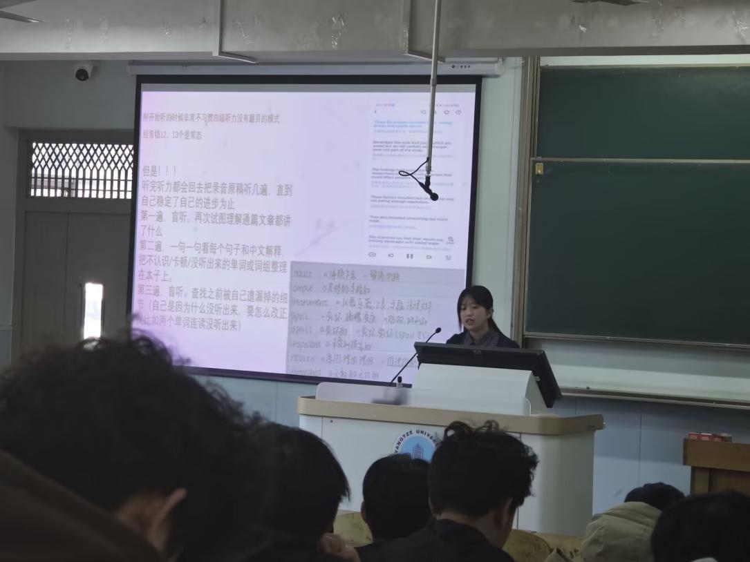 资工油光22201雷航以“逆风翻盘”为题,讲述自己如何在完全没有听力基础的情况下,通过反复练习真题录音,熟悉语速和口音,最终在四级考试中取得高分。资工(卓越)22301班的韩艾希分享自己在备考时会根据自身实际水平设定合理的目标分数,并在达成目标时给自己一个小奖励,以激励自己不断努力。资工12401班的卜文杰提醒同学们一定要加强单词背诵,自己经常使用“百词斩”,以图片、视频讲解单词,生动有趣,适合碎片化学习。地信12401班的王梓璇说:“改变拖延的习惯,我们的备战就成功了一半。”几位同学分享了自己的备考经验和学习方法。他们从词汇积累、听力训练、阅读理解、写作技巧等方面进行了详细的介绍,并建议同学们合理安排时间,制定科学的学习计划,多做真题,注重总结错题,不断提高自己的英语综合能力。
