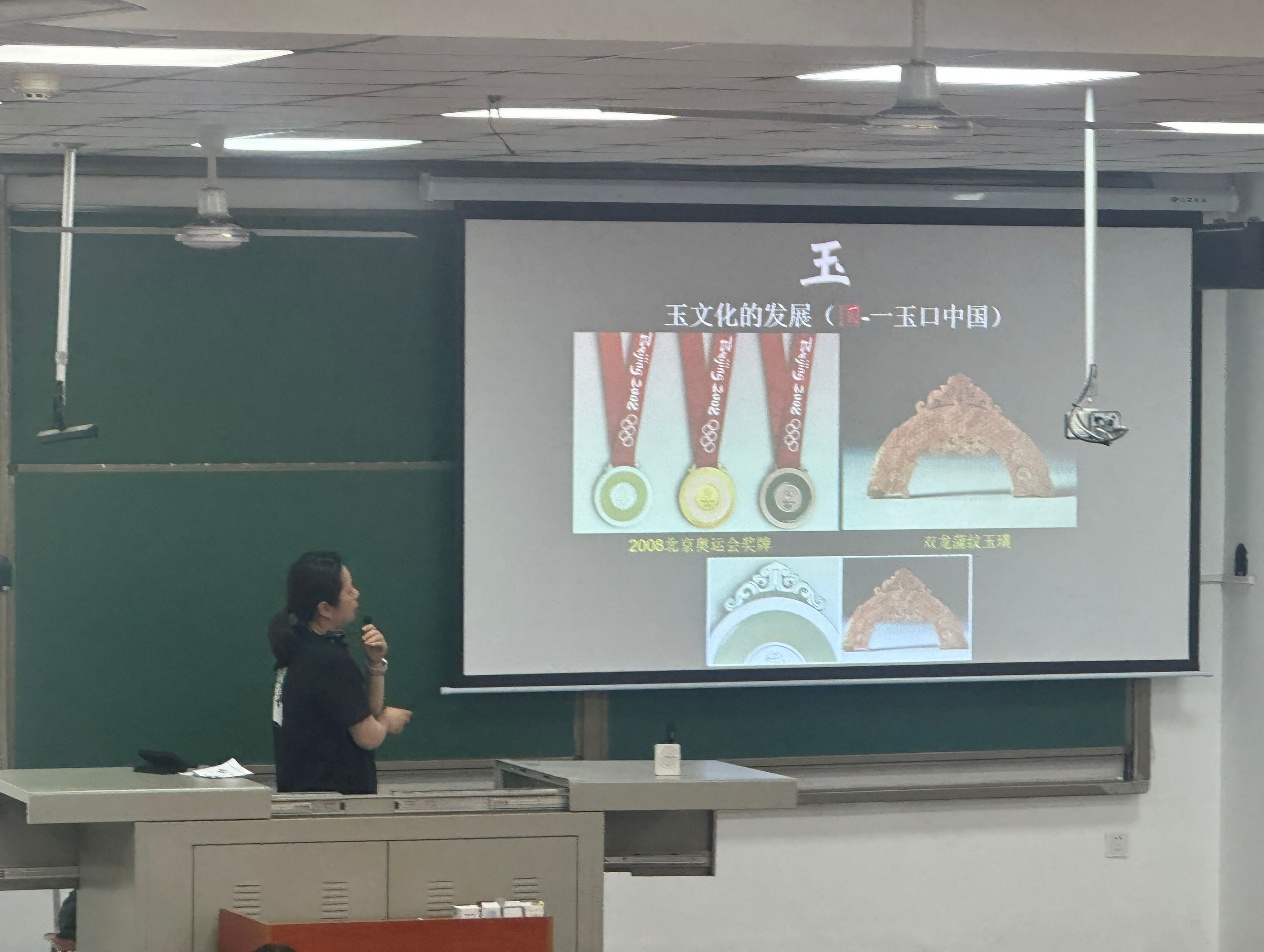 活动中,高老师围绕玉文化的发展脉络展开了一场精彩绝伦的讲解,从良渚文化中的玉琮,到商周时期的玉璧,再到汉代的玉舞人,老师用生动的语言和丰富的图片资料,让学生仿佛亲眼目睹了玉文化在不同历史阶段的独特魅力。讲解特别聚焦翡翠专题,高老师从翡翠的形成过程讲起,用通俗易懂的语言解释了翡翠是如何在特定的地质条件下,经过漫长的岁月才得以诞生的。让学生对翡翠的形成有了直观而深刻的认识。