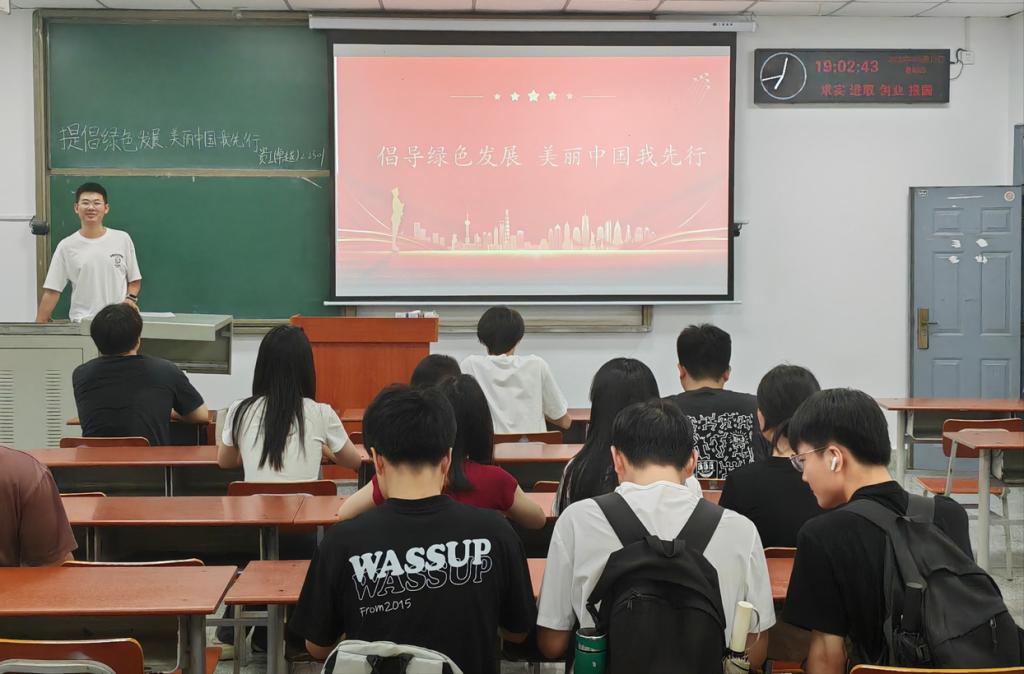 团支书成星星首先阐释“倡导绿色发展,美丽中国我先行”理念内涵,结合生态环保案例,说明绿色发展对美丽中国建设的关键意义。接着围绕“青年在绿色发展与美丽中国建设中的责任与行动”这一主题,动员大家用实际行动践行绿色生活,以专业所学助力生态保护与绿色发展。