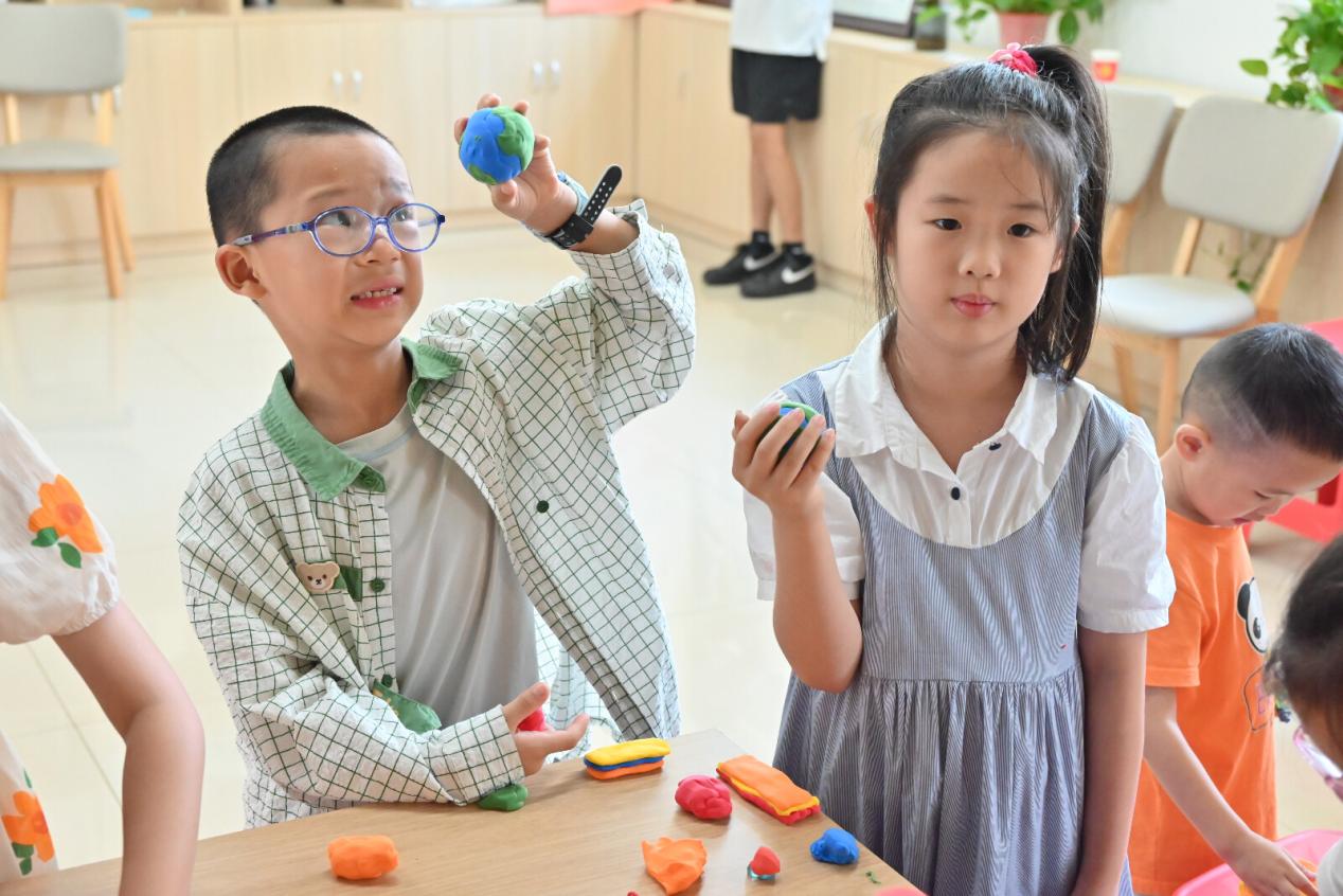 随后,储思佳将科普的焦点转向了地球的内部结构。为了让孩子们更直观地理解这一抽象的知识,他巧妙地利用现场发放的不同颜色的橡皮泥,开启了一场趣味十足的“地球构造”手工课。他一边详细地讲解地球的各个圈层,从地核的炽热到地幔的流动,再到地壳的坚硬,一边示范着如何用橡皮泥模拟地球的结构。孩子们全神贯注地听着,小手跟着储思佳的指导忙碌起来,不一会儿,一个个色彩斑斓、形态各异的“地球”在孩子们的手中诞生了。看着自己的作品,孩子们的脸上洋溢着自豪的笑容,对地球的内部结构也有了更深刻的认识。
