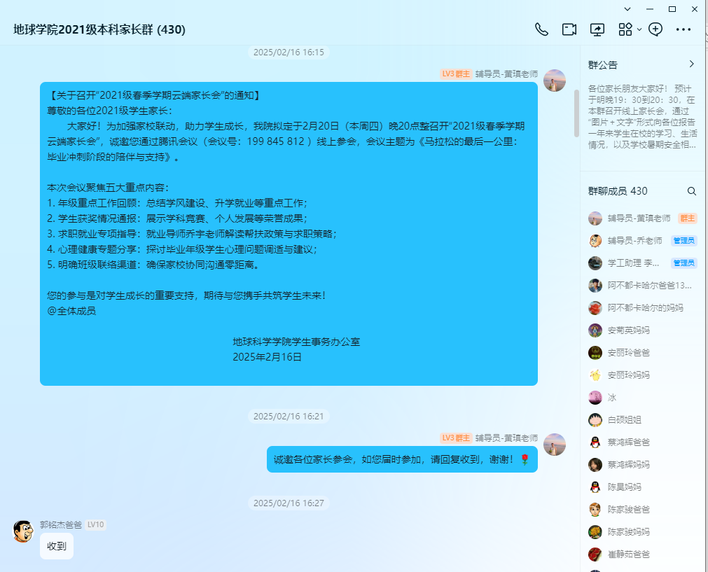 (通讯员刘佳琪)9月4日晚8点,金碧娱乐场 以“马拉松的最后一公里:毕业冲刺阶段的陪伴与支持”为主题,通过腾讯会议组织召开了2021级本科生春季学期开学初家长会。会议由年级辅导员黄瑱主讲,围绕毕业阶段重点工作与家校协同育人展开深入交流,旨在凝聚家校合力,助力学生顺利毕业、平稳过渡。