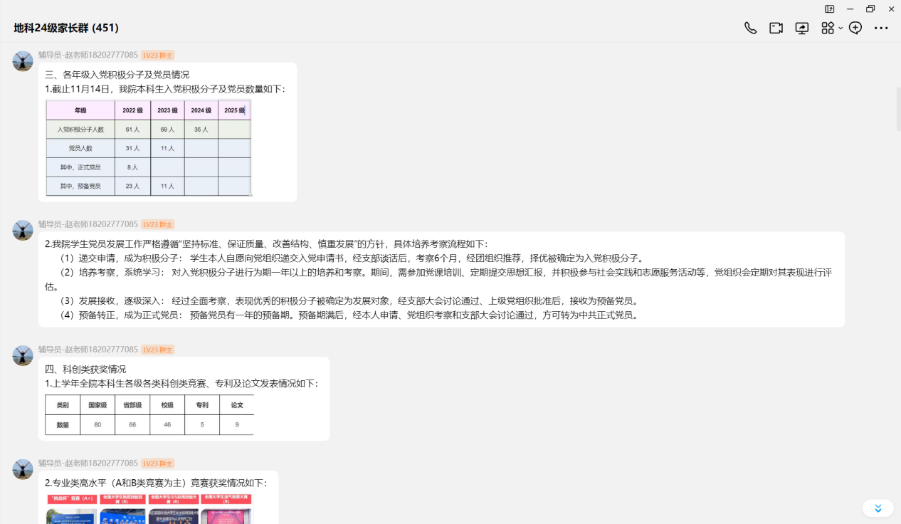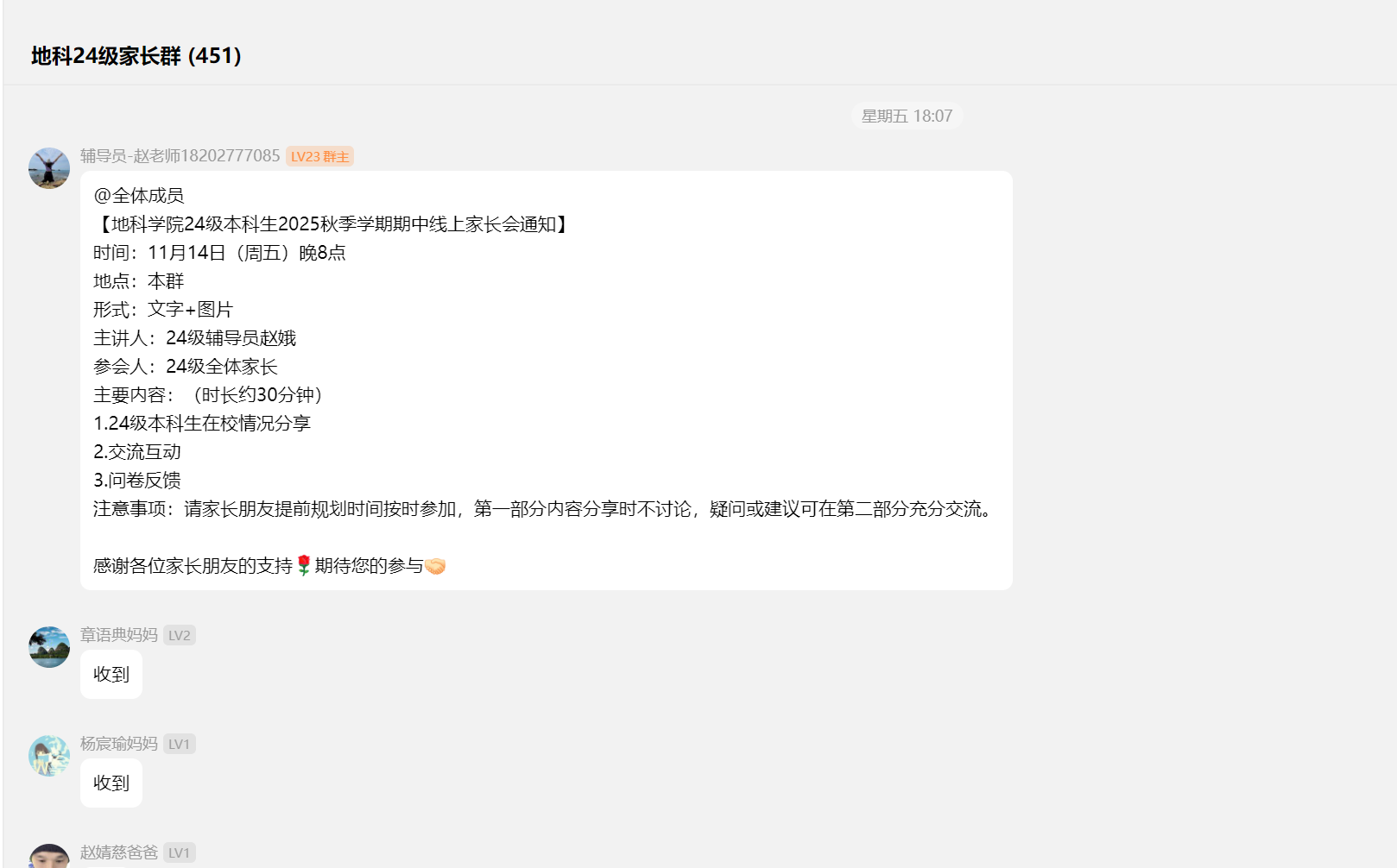 (通讯员 王彩蓓)为进一步加强家校之间的沟通与协作,构建家校共育的桥梁,共同促进学生全面成长与未来发展,11月14日晚8点,金碧娱乐场 24级本科生本学期期中线上家长会顺利开展。会议由辅导员赵娥老师主讲,全体24级家长参与。 会议从家长关心的学业成绩、评奖评优、学科竞赛等方面展开,向家长们展示了金碧 持续强化学风建设,通过课堂考勤与学业帮扶机制关注学生成长,并呼吁家长共同督促学生重视英语四级考试与专业学习。在思想引领与成长支持方面,金碧 严格规范党员发展流程,并通过心理关怀、宿舍文明建设及丰富多彩的科创、心育活动为学生营造积极健康的成长环境。同时,会议结合近年考研趋势与就业形势,建议家长引导学生尽早明确生涯规划,扎实学业基础,提升综合竞争力。 交流答疑环节,家长们就英语四六级、孩子专业以后的就业方向等问题踊跃提问,赵老师就家长们关心的问题进行了耐心、细致的解答,获得了家长们的一致好评。 此次线上家长会,虽隔屏幕,却未阻隔家校心连心的交流。它不仅让家长们对孩子的在校情况有了更立体的了解,也进一步明确了家校合作发力的方向。我们坚信,唯有家校同心,携手并进,方能共同托举起孩子们更加光明、灿烂的未来! (编辑 郭霖 审核 冯舒)