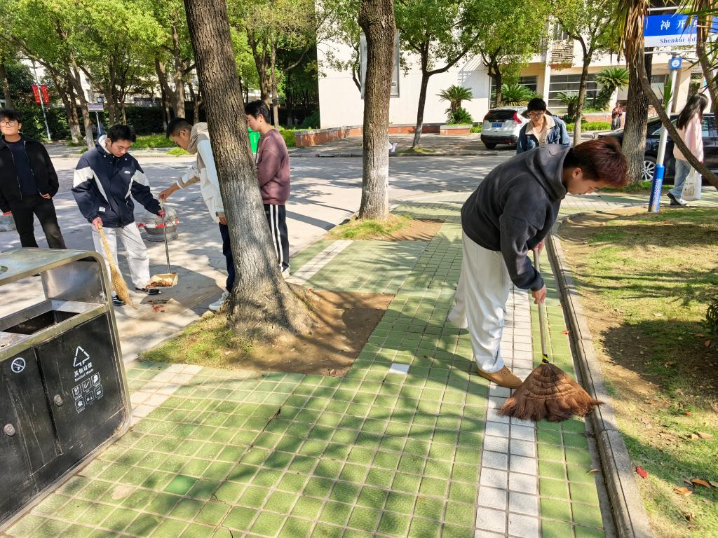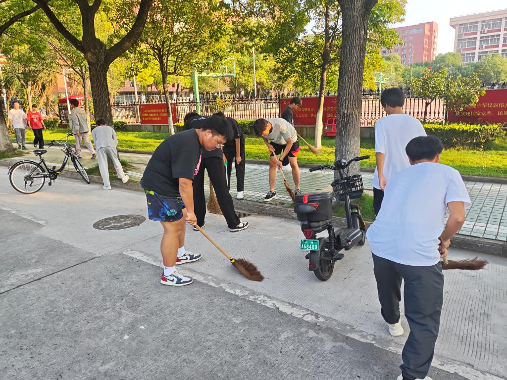专兼职辅导员带领下,同学们分工协作,对责任路段进行全面清洁,清扫路面垃圾、将电动车摆放整齐,使校园环境焕然一新。