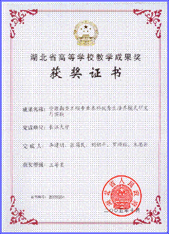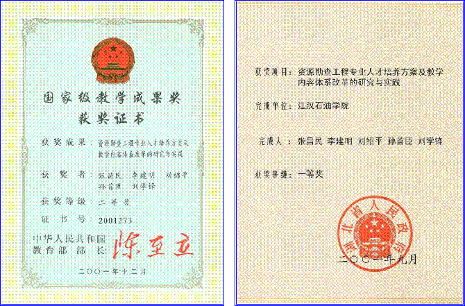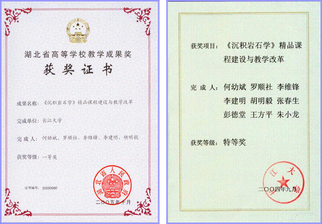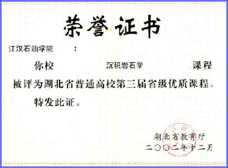| 近五年来,课程建设小组教师积极开展教学研究,不断改革教学方法,提高教学质量。先后有 7 人次获得校级教学质量优秀奖, 1 人次获得系级教学质量优秀奖。 2001年,“资源勘查工程专业人才培养方案及教学内容体系改革的研究与实践”获国家级高等教育教学成果二等奖。 2002年,《沉积岩石学》被评为湖北省普通高校第三届省级优质课程,2003年被评为省级精品课程。 2004年,“资源勘查专业本科优秀生培养模式研究与实践”获长江大学教学成果一等奖,2005 年获省级三等奖。 2004年,“沉积岩石学精品课程建设与教学改革”获长江大学教学成果特等奖,2005 年获省级一等奖。 2004年,“长江三峡地层沉积相微缩剖面教学基地建设与研究”获长江大学教学成果一等奖,2005 年获省级一等奖。