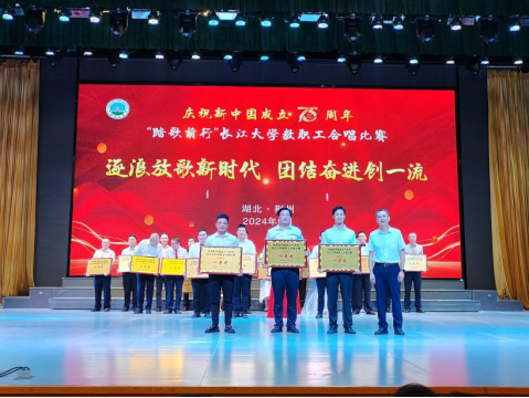 比赛当天老师们个个精神饱满、斗志昂扬,以整齐的阵容、昂扬的激情、嘹亮的歌声出色的完成了演唱。伴着深情的朗诵,演绎“勘探队员”的小情景剧逐步展开,他们手持地质图、地质锤、罗盘、放大镜等野外工作“四宝”,用坚定的眼神、昂样的姿态,向观众们展现地质工作者有理想、敢担当,能吃苦、肯奋斗的勘探精神。全国模范教师胡明毅教授与湖北名师林小云教授倾情献唱,全国优秀教师何幼斌教授也登台表演,再现野外考察指导学生的场景。青年教师赵少卿、郭霖用深情的朗诵再现了那激情燃烧的岁月里,长江大学的勘探队员们不畏艰难险阻,南征北战,以天为被地为床,把最深沉的爱献给祖国大地山川,献给了祖国的石油勘探事业,把科研论文写在了祖国的大地上。合唱的背景视频也充分展示了金碧