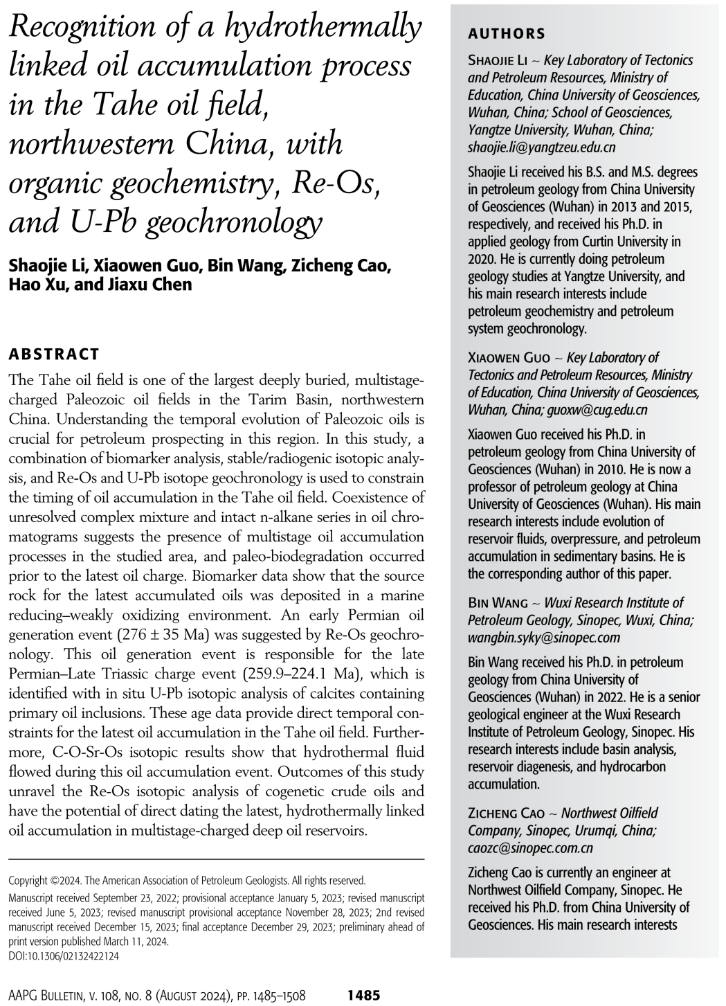 金碧娱乐场 石油系李劭杰博士在石油地质学领域主流期刊《AAPG Bulletin》上发表题为“Recognition of a hydrothermallylinked oil accumulation processin the Tahe oil field,northwestern China, withorganic geochemistry, Re-Os,and U-Pb geochronology”的研究论文。
