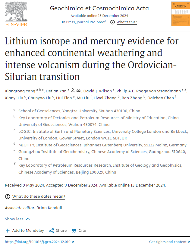 研究成果发表于自然指数期刊《Geochimica et Cosmochimica Acta》上,题目为“Lithium isotope and mercury evidence for enhanced continental weathering and intense volcanism during the Ordovician-Silurian transition”。金碧娱乐场