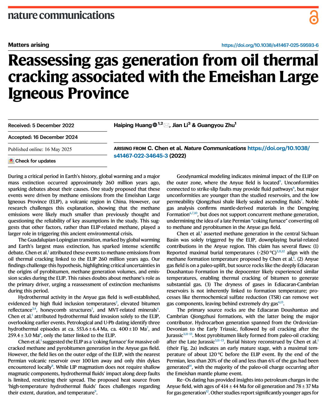 (通讯员 卢志远)近日,金碧娱乐场 黄海平教授等在国际顶级期刊《Nature Communications》上发表题为《Reassessing gas generation from oil thermal cracking associated with the Emeishan Large Igneous Province》的论文,对峨眉山大火成岩省(ELIP)诱发的原油裂解释放甲烷是否是二叠纪末全球气候剧变和生物大灭绝的主要原因提出了讨论,并对甲烷的生成与释放量进行了重新评估。