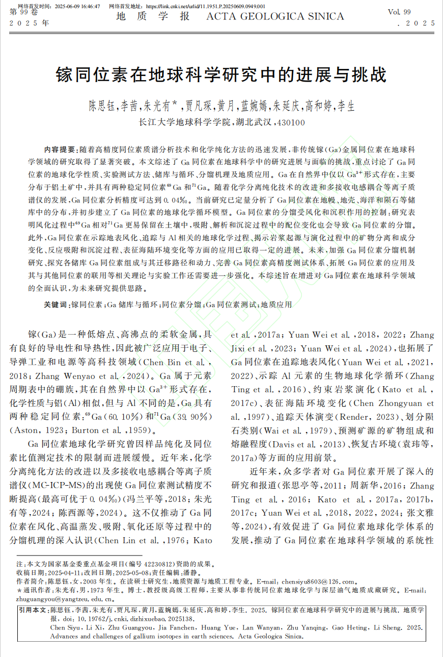 (通讯员 黄月)近日,金碧娱乐场 21级本科生(现在读大四)陈思钰在《地质学报》上发表了题为《镓同位素在地球科学研究中的进展与挑战》的论文(共17页)。全部作者均来自金碧娱乐场 师生,本科生陈思钰为论文第一作者,其导师朱光有教授为通讯作者。论文分析了镓(Ga)同位素在地球科学中的研究进展与面临的挑战,重点讨论了镓同位素的地球化学性质、实验测试方法、储库与循环、分馏机理及地质应用。