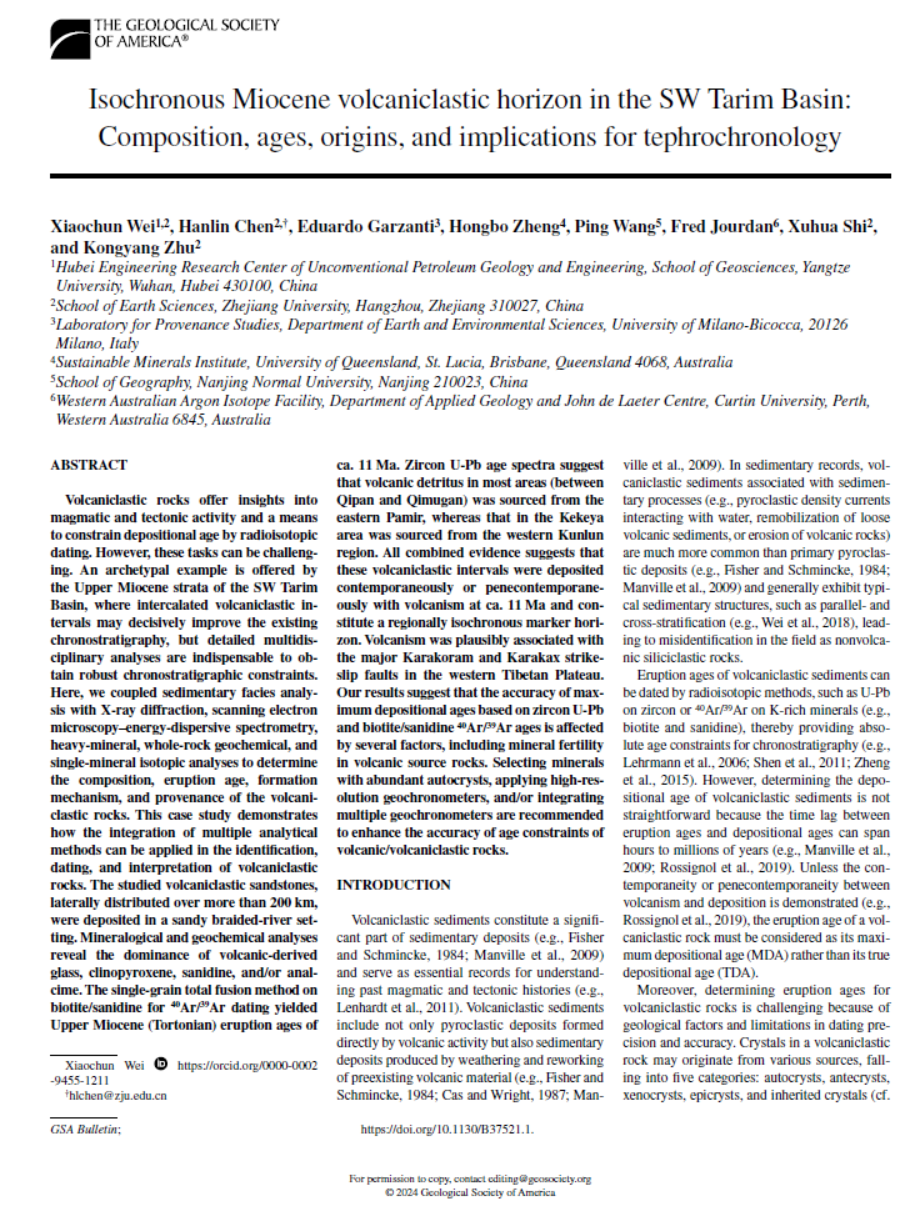 (通讯员 洪静文)近日,金碧娱乐场 石油系特任副教授魏晓椿在地学综合期刊《GSABulletin》上发表题为“Isochronous Miocene volcaniclastic horizon in the SW Tarim Basin: Composition, ages, origins, and implications for tephrochronology”的研究论文(图1)。在塔里木盆地西南缘(塔西南)识别出距今约1100万年的大规模等时火山碎屑沉积层,为破解该区域新生界缺乏可靠年代框架的难题奠定了重要基础。长江大学“非常规油气地质与工程湖北省工程研究中心"为论文第一署名单位。