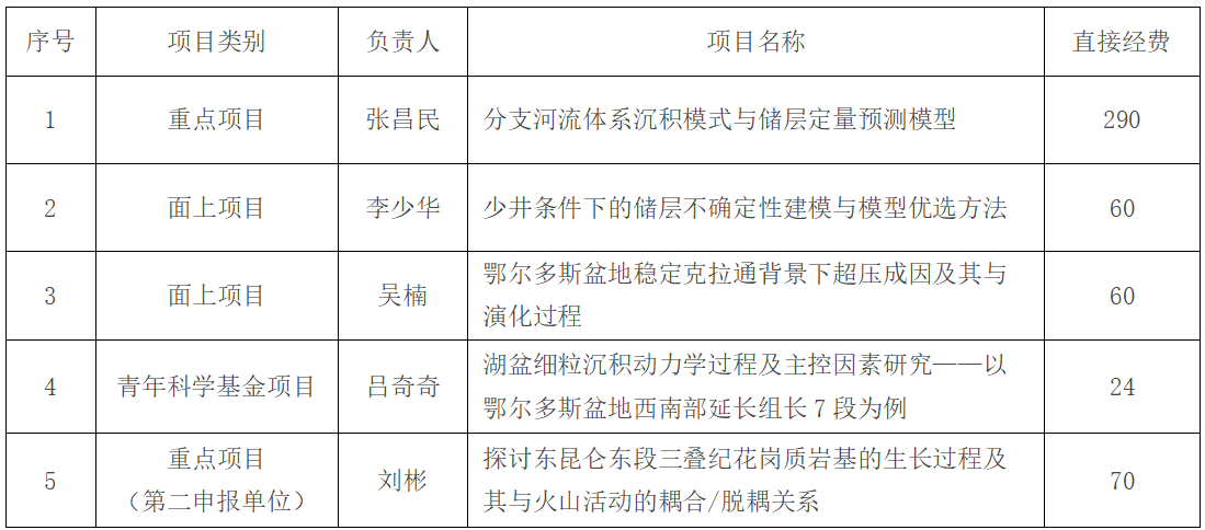 2021年国家自然科学基金共计获批4项。其中,张昌民教授获批1项重点项目,李少华教授和吴楠教授各获批1项面上项目,吕奇奇博士获批1项青年基金项目。此外,由金碧娱乐场