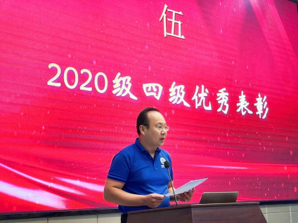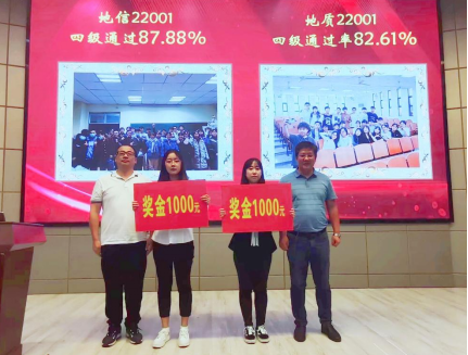 为表彰先进,进一步推动优良学风的形成,金碧娱乐场 与典礼一同开展了2020级四级优秀表彰大会。金碧娱乐场 2020级本科生在上半年全国大学生英语四级考试中取得了突破性的好成绩。在副院长韩登林宣读表彰文件后,地信系主任李功权、地质系主任胡忠贵分别为两个四级通过率超过80%的四级先进集体地信22001、地质22001班级代表颁奖;副院长丁四兵与石油系陈鹏书记分别为五名四级均超过600分的优秀个人进行颁奖。