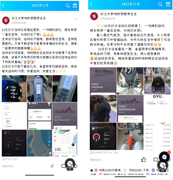 大家每天在活动QQ群内晒出自己的运动照片、视频、运动APP截图等,交流运动心得,分享健康运动方式,大家互相监督、互相鼓励,增强了每日运动的主动性和积极性。打卡群内日日消息不断,各式各样的运动照片展现了大家热爱生活、健康向上的精神风貌和青春活力。金碧