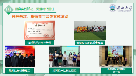 励新杯”冠军、“清晓杯辩论赛”冠军,并作为评委被授予“优秀评委”荣誉称号……班级多次组织同学参加学校各类文体活动,如校级篮球赛、拔河比赛、跳大绳比赛、五四大合唱比赛等。学生会、大学生艺术团、国旗护卫队、社团联合会、蒲公英之家等各级各类组织,到处都有同学们靓丽的身影。丰富多彩的文体活动,既增强了团组织的凝聚力,又让全班同学在紧张的学习生活之余得到放松,身心健康发展。
