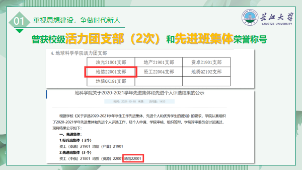 作为共产主义事业的接班人,作为二十一世纪的新主人,思想建设历来都是班级工作的重点。为帮助同学们学习先进的科学理论,鼓励同学们主动向党组织靠拢,号召大家做合格的团员和合格的党员,班级体通过组织团会、集体观看纪录片、知识问答竞赛等同学们喜闻乐见的形式,充实理论学习。因此,同学们的思想觉悟得到了很大的提高。目前,全班同学都递交了入党申请书,其中已有12名同学被确定为入党积极分子,并以优异的成绩通过考试,顺利结业;5名同学成为了预备党员。一份耕耘,一份收获,在2020-2021学年及2022-2023学年活力团支部竞选过程中,我们众志成城,获得院级“活力团支部”荣誉称号,在2020-2021学年,我们班获得了院级的“先进班级体”称号。全班同学积极参加无偿献血、清扫烈士墓、义务植树、志愿服务等各类活动。在“姚家林支教”大型公益活动中,三人被评为优秀志愿者;疫情时期,多数同学在家参与抗疫志愿者活动,黄汉臣、董培宣、张之悦、翁向向四位党员均被评为当地的“优秀志愿者”。