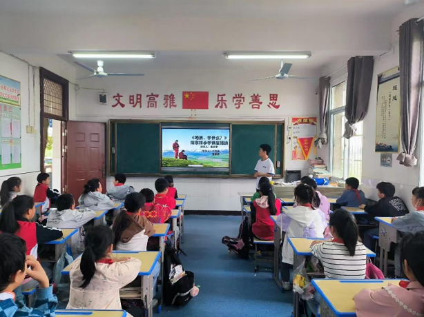 志愿者朱贵宇同学用通俗易懂的语言为小朋友们讲解地质知识,提出了“怎么来定义山”、“什么叫作河”、“石油跟我们的生活有什么关联”等问题调动小朋友们的好奇心,引发他们的思考。小朋友们积极配合,纷纷举手回答问题,课堂气氛热烈。