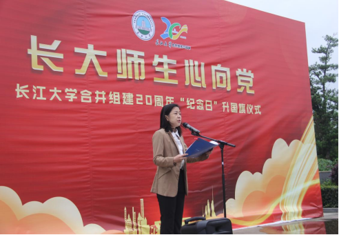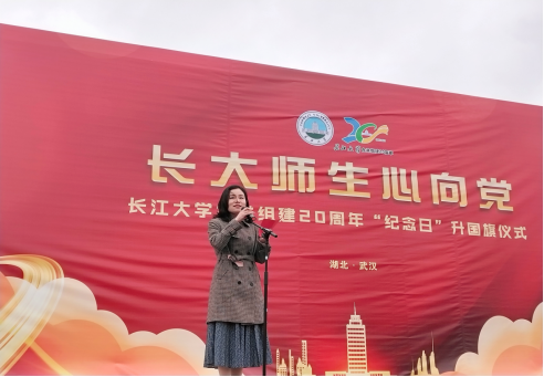 于武汉校区田径场举行“长大师生心向党”暨长江大学合并组建20周年纪念日升国旗仪式。仪式由金碧娱乐场