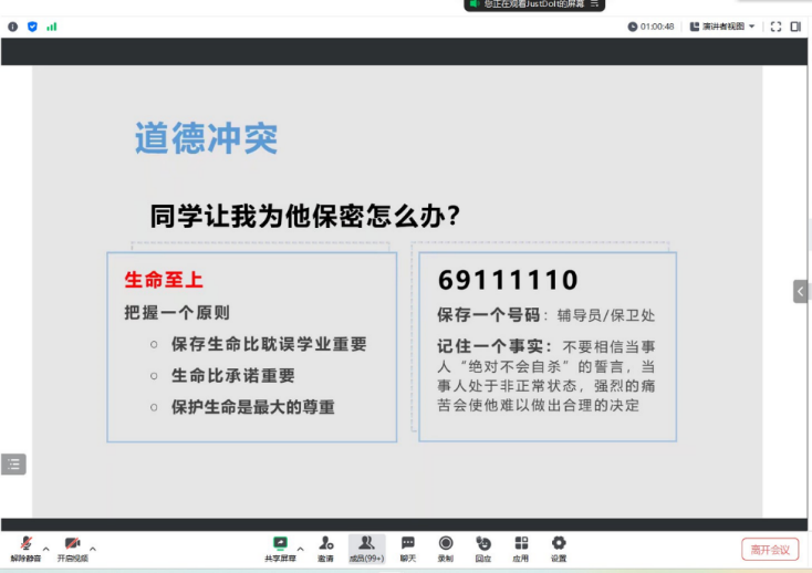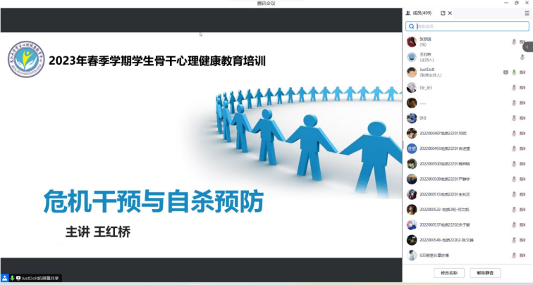 于2023年6月30日通过腾讯会议的方式举行以“危机干预与自杀预防”为主题的心理讲座。各年级班长、团支书、安全员、心理委员、寝室长及暑期留校学生等共计499名师生参与学习交流,心理专干王红桥老师主讲。